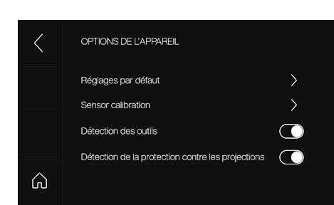 Remarque : Veuillez vérifier si la détection des outils et de la protection contre les projections est enclenchée. Les détections activées permettent d’éviter des erreurs de commande et un endommagement de l’appareil.