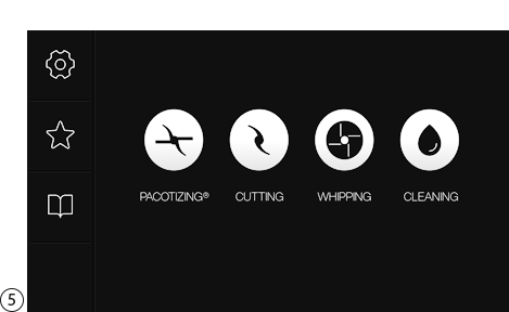 터치스크린에 시작 메뉴가 나타납니다. 가공 모드(Pacotizing®, 커팅, 휘핑) 및 세척 모드와 설정, 즐겨찾기, 매뉴얼을 여기에서 선택할 수 있습니다.