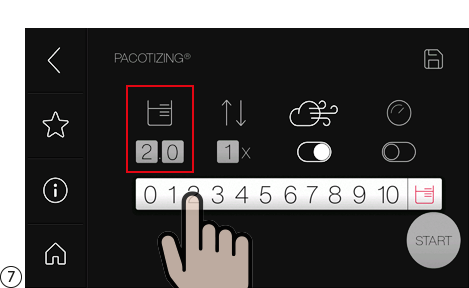 표시된 숫자 라인에서 적절한 숫자를 사용하여 분량(왼쪽 숫자 = 전체 분량, 오른쪽 숫자 = 10분의 1 분량)을 선택합니다.