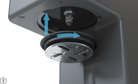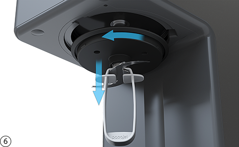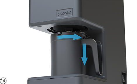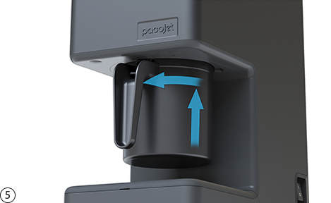 Pacotizing® 후 보호용 비커를 비틀어 빼냅니다. 보호용 비커의 손잡이에 있는 레버를 누르면 쉽게 분리할 수 있습니다.