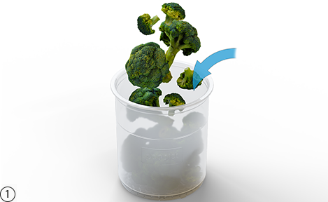 주의: 음식을 충분히(-20°C / -4°F 이하) 얼리지 않은 경우 장치 및 액세서리가 손상될 수 있습니다! Pacotizing® 비커가 냉동고에서 수평을 유지하도록 하여 Pacotizing® 비커 표면이 평평하게 얼도록 합니다. 이미 냉동된 식품을 다시 Pacotizing® 비커에 넣지 마십시오.