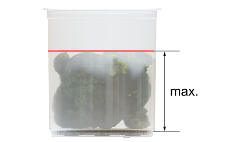 참고: Pacotizing® 비커를 채울 때 표면이 매끄러운지, Pacotizing® 비커가 채움선보다 높지 않게 채워졌는지, 빈 공간은 없는지 확인합니다(필요한 경우 물, 육수 등의 액체로 채웁니다). 혼합물을 너무 단단하게 얼려서는 안 됩니다.