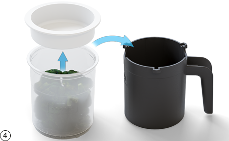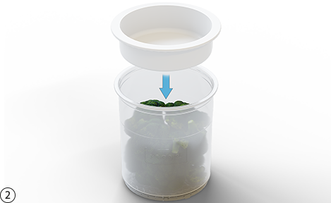 냉동실에서 조리 식품이 담긴 Pacotizing® 비커를 꺼냅니다. 비커 뚜껑을 제거합니다. Pacotizing® 비커를 보호용 비커 안에 넣습니다.