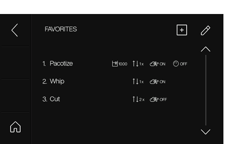 즐겨찾기: 가장 중요한 레시피는 처리 설정(분량, 반복 횟수, 정상 압력/과압, 빠른 처리)과 함께 저장됩니다.