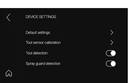 툴 감지: 툴 감지를 활성화/비활성화합니다. 사용 중인 장치에서 이 기능이 활성화 또는 비활성화되어 있는지 확인하십시오. 툴이 부착되어 있지 않으면 활성화 시 경고가 나타납니다. 비활성화하면 경고가 표시되지 않습니다.