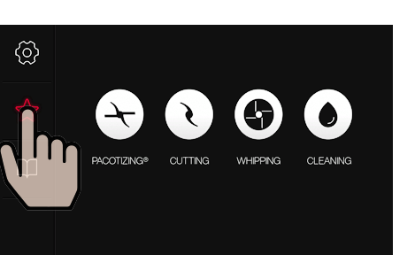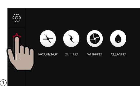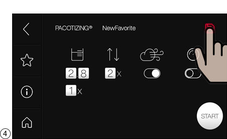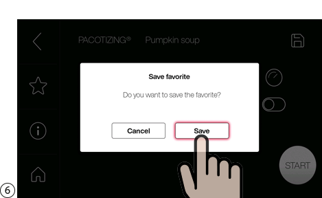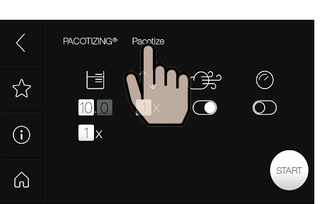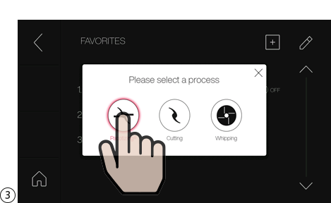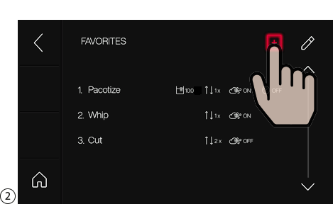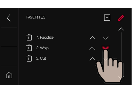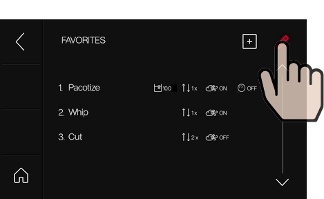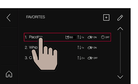 Pacotizing®, 커팅 또는 휘핑에 대한 장치 설정은 반복하거나 나중에 사용할 수 있도록 저장 버튼을 눌러 즐겨찾기로 저장할 수 있습니다. 메인 메뉴에서 "Favorites(즐겨찾기)"를 선택합니다.