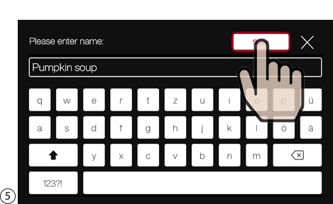 키보드를 사용하여 레시피 이름을 입력하고 "Save(저장)"를 누릅니다.