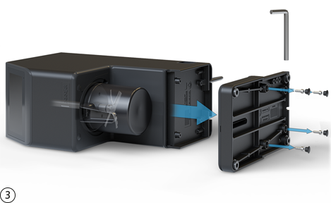 육각 렌치로 4개의 플레이트 나사를 풀고 베이스 플레이트를 제거합니다.